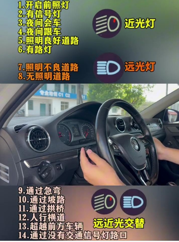 上车准备好后,我告诉安全员我可以开始考试,然后我会模拟夜间驾驶灯的使用。
