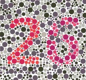 正常的色觉的人看到的应该是数字26。如果你是红色盲,你看到的就只是数字6,如果你是绿色盲,你就只能看到数字2,全色盲在这个图形里什么也看不到。