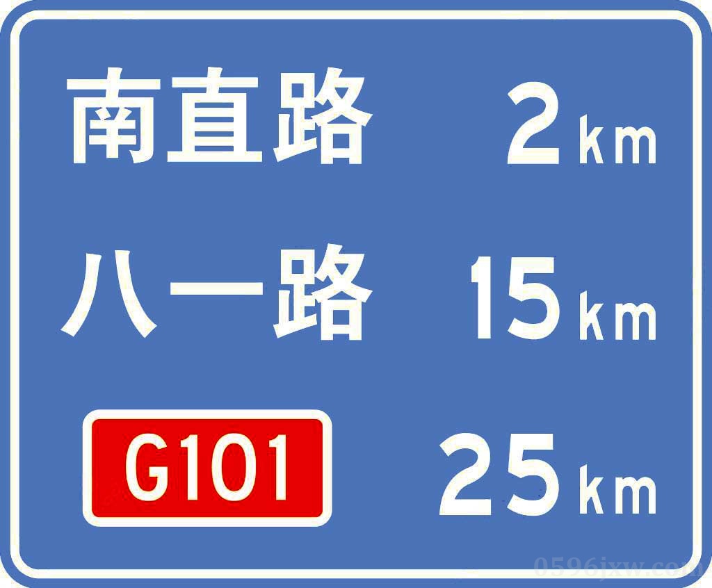 用以确认当前所行驶的道路信息及前方通往方向信息。指示前方所要经过的重要公路编号、道路名、地名和距离。设在交叉路口后300m--400m处。