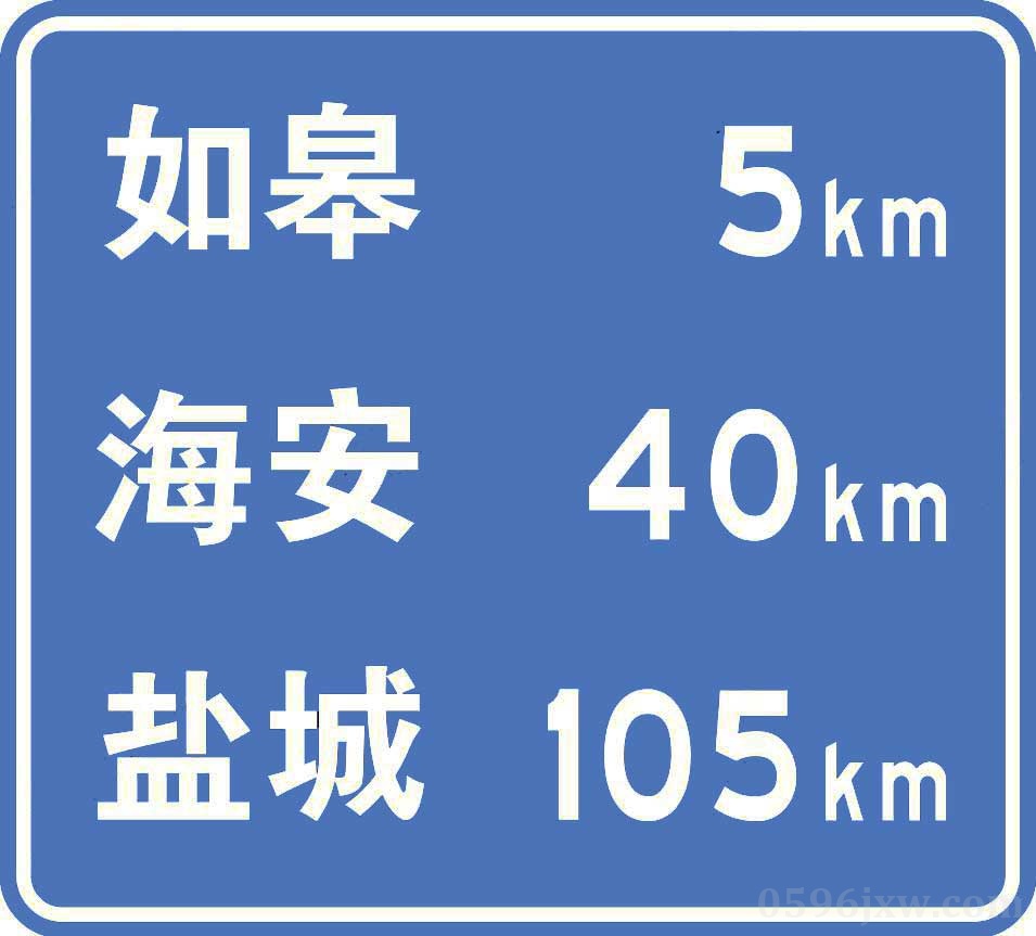 用以确认当前所行驶的道路信息及前方通往方向信息。指示前方所要经过的重要公路编号、道路名、地名和距离。设在交叉路口后300m--400m处。