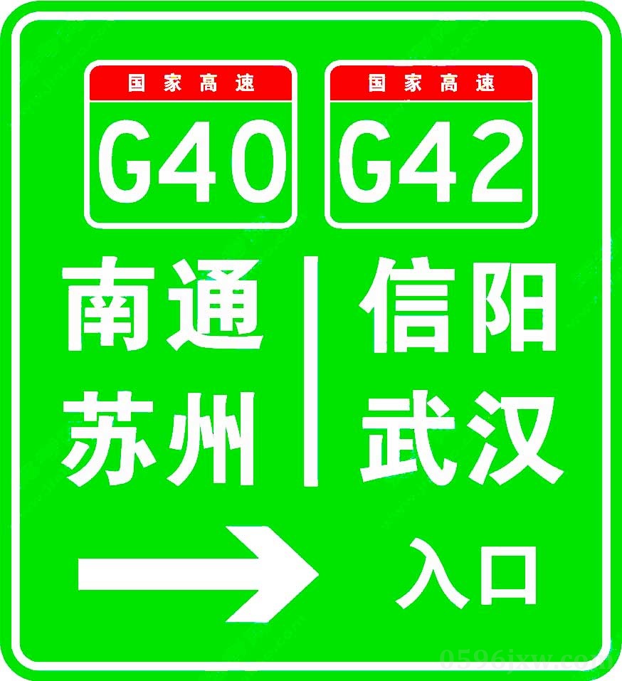驶入的高速公路或城市快速路为两条路重合路段,入口预告标志应同时指出两条路的编号信息及驶人道路的方向信息,如果重合路段较短,需要选择重合路段之外的地名作为方向信息。