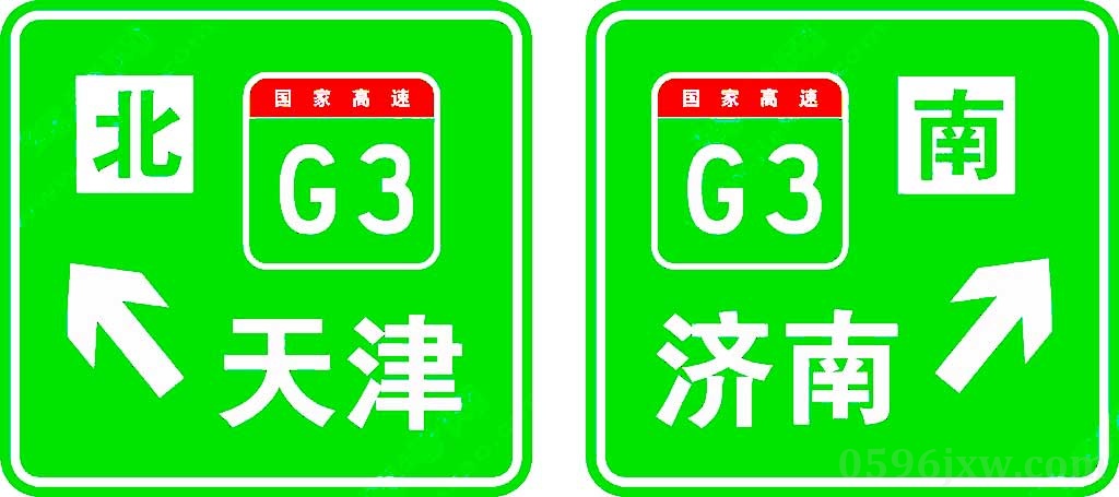 用于指示高速公路或城市快速路两个行驶方向,设在驶入高速公路或城市快速路的匝道分岔点处。在目的地信息之上,可增加前往高速公路的编号信息,也可增加高速公路的方向信息。